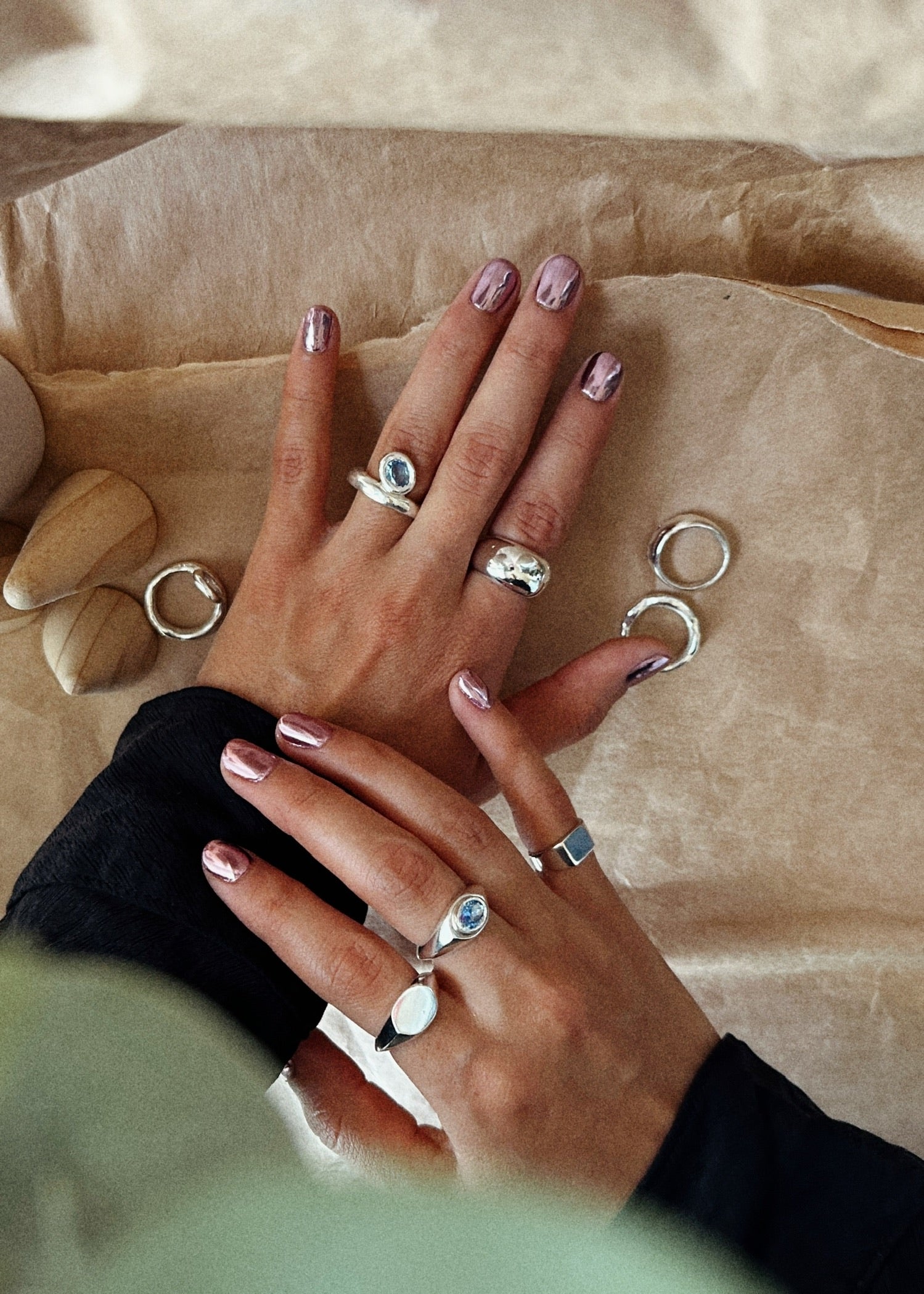 A soft, bubbled silhouette carved in wax and sand-cast in sterling silver, polished to a mirror-like shine. This sculptural piece catches light and reflections alike - bold in form, luminous in spirit.